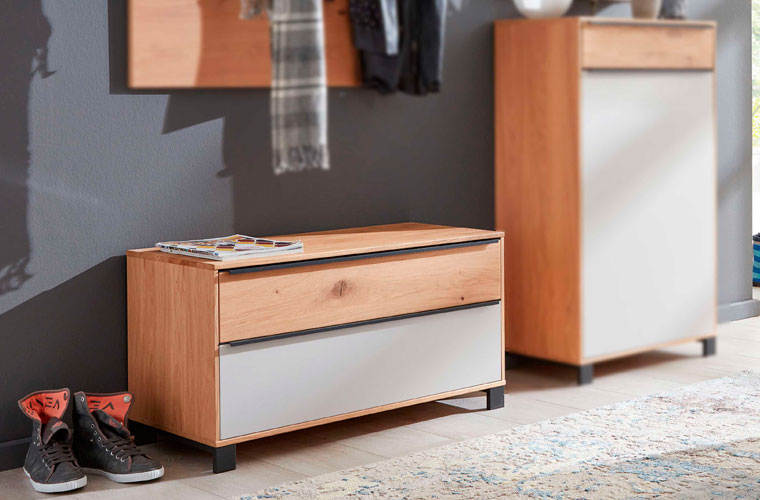 Bei der Ausstattung der Garderobe bleibt kaum ein Wunsch offen. Von Schränken und Highboards zum verstauen der Anziehsachen, über Sitzbänke mit hochwertigen Sitzkissen zum Schuhe anziehen, bis hin zu Schuhschränken, Kommoden und Spiegeln bleibt kein Wunsch offen. Zusätzlich kann man die Elemente noch weiter individualisieren, zum Beispiel besteht die Wahl zwischen schlichten Fußgleitern, robusten Metallkufen oder hängender Montage. Zu einigen Garderoben Serien gibt es auch passende Wohnzimmermöbel für einen schönen Übergang zwischen Wohnzimmer und Flur.