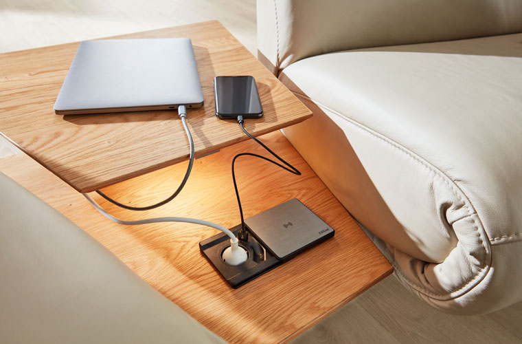 Nie wieder auf der Suche nach einer Steckdose in der Nähe sein. Mit den intelligent, integrierten Medienplänen in den Sofas können Sie ohne Probleme während dem Fernsehen Ihr Handy laden. Das Media Relax Element wird ganz einfach ausgeklappt und ist nach Wunsch sogar mit Beleuchtung verfügbar.