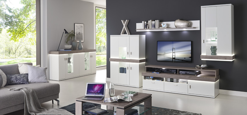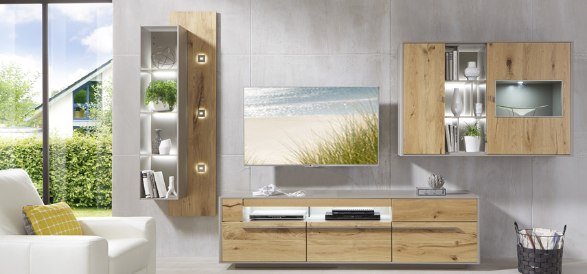 Wer bei dem Wort Wohnwand immer noch an eine massive Holzwand im Wohnzimmer denkt, liegt heutzutage falsch. Die Zeiten, in denen wuchtige Möbel den Raum förmlich erdrücken, sind lange vorbei! Helle Hölzer in Kombinationen mit Hochglanz-Lackfronten, Glas und indirekter Beleuchtung machen Wohnwände zu stilvollen Hinguckern im Wohnzimmer.